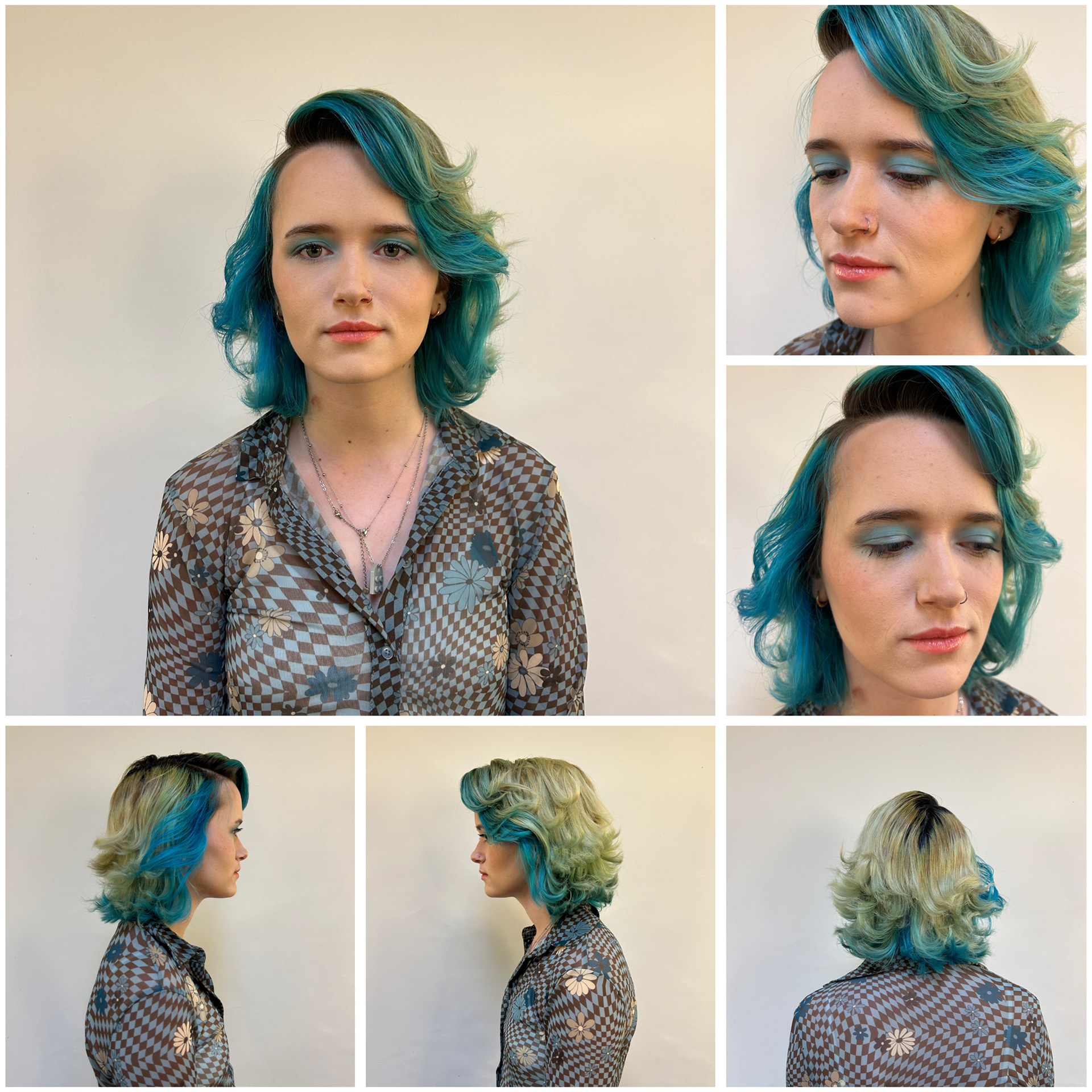 Prior to this, I had engaged in extensive discussions regarding the dyed hair and the possibility of spraying the hair or using a wig. I was then informed that the film would be in black and white, so the hair colour would not be an issue. After completing my practice run, I was told that the hair looked great and was historically accurate. I maintained the same style for the final look and was later asked to change the fringe, which I had little problem doing.